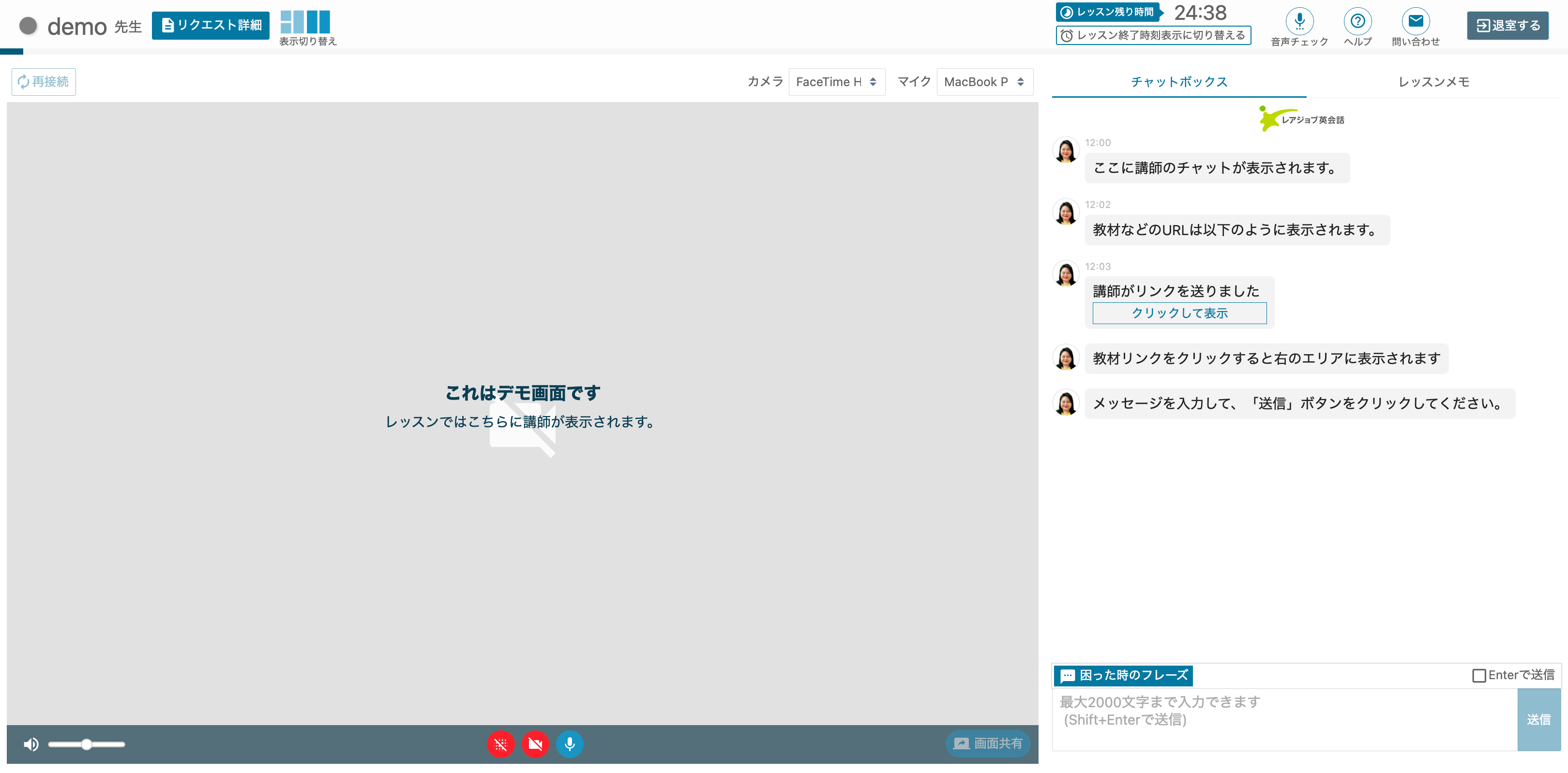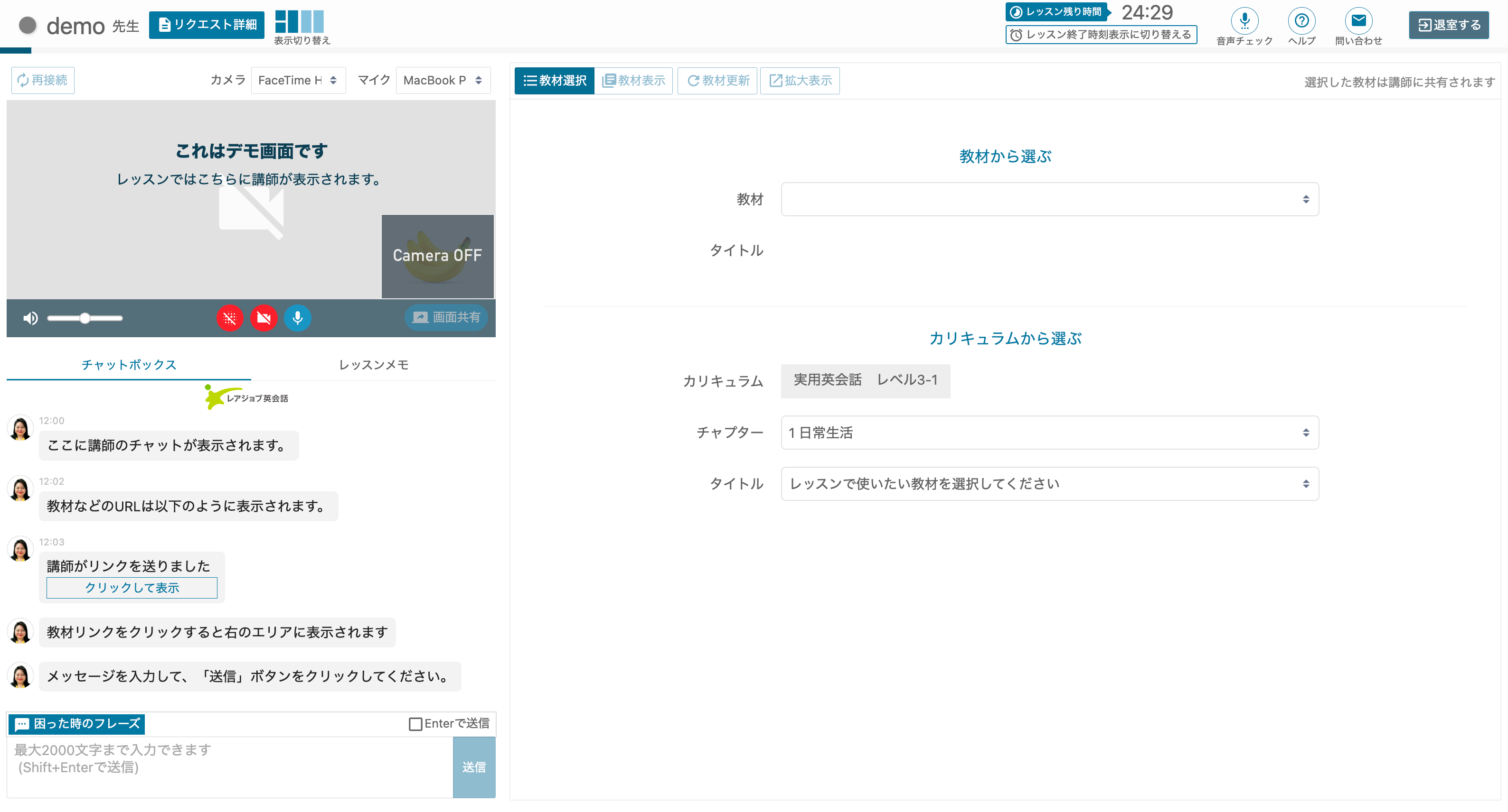 一覧にて選択した教材の情報は、講師側に共有されます。レッスン中に教材を変更したい場合にご活用ください。